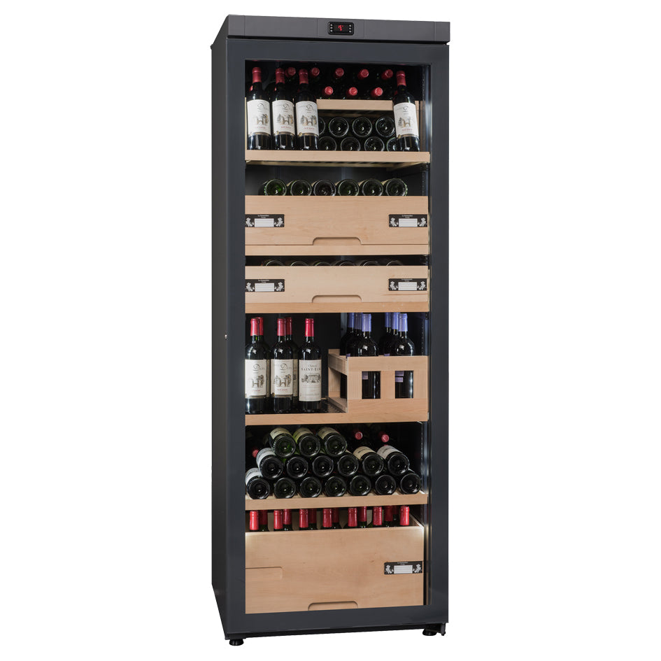 <p><span style="color:rgb(33,43,54);">Kapazität: 329 Flaschen*</span><br> <span style="color:rgb(33,43,54);">Kostenlose Installation</span><br> <span style="color:rgb(33,43,54);">Farbe: Rahmen und Tür anthrazitgrau</span><br> <span style="color:rgb(33,43,54);">Kühlsystem: Kompressor</span><br> <span style="color:rgb(33,43,54);">Kühlung: Belüftet</span><br> <span style="color:rgb(33,43,54);">Einstellbare Temperatur:</span><br> <span style="color:rgb(33,43,54);">- oberer Teil von 17° bis 19°C</span><br> <span style="color:rgb(33,43,54);">- mittlerer Teil von 13° bis 15°C</span><br> <span style="color:rgb(33,43,54);">- unterer Teil von 7° bis 9°C</span><br> <span style="color:rgb(33,43,54);">Elektronische Regulierung</span><br> <span style="color:rgb(33,43,54);">Digitales Thermometer mit Display</span><br> <span style="color:rgb(33,43,54);">Weiße LED-Beleuchtung</span><br> <span style="color:rgb(33,43,54);">Glastür mit Schloss, doppelt gehärtetes Glas mit Anti-UV-Behandlung</span><br> <span style="color:rgb(33,43,54);">Kompatibel mit der</span> <a href="https://cdn.shopify.com/s/files/1/0561/8535/6486/files/VINOTAG.pdf?v=1663343823"><span style="color:rgb(150,0,0);"><strong>VINOTAG®</strong></span></a> -Anwendung<br> <span style="color:rgb(33,43,54);"><i>(siehe Eigenschaften, in Zusammenarbeit mit VIVINO)</i></span></p>