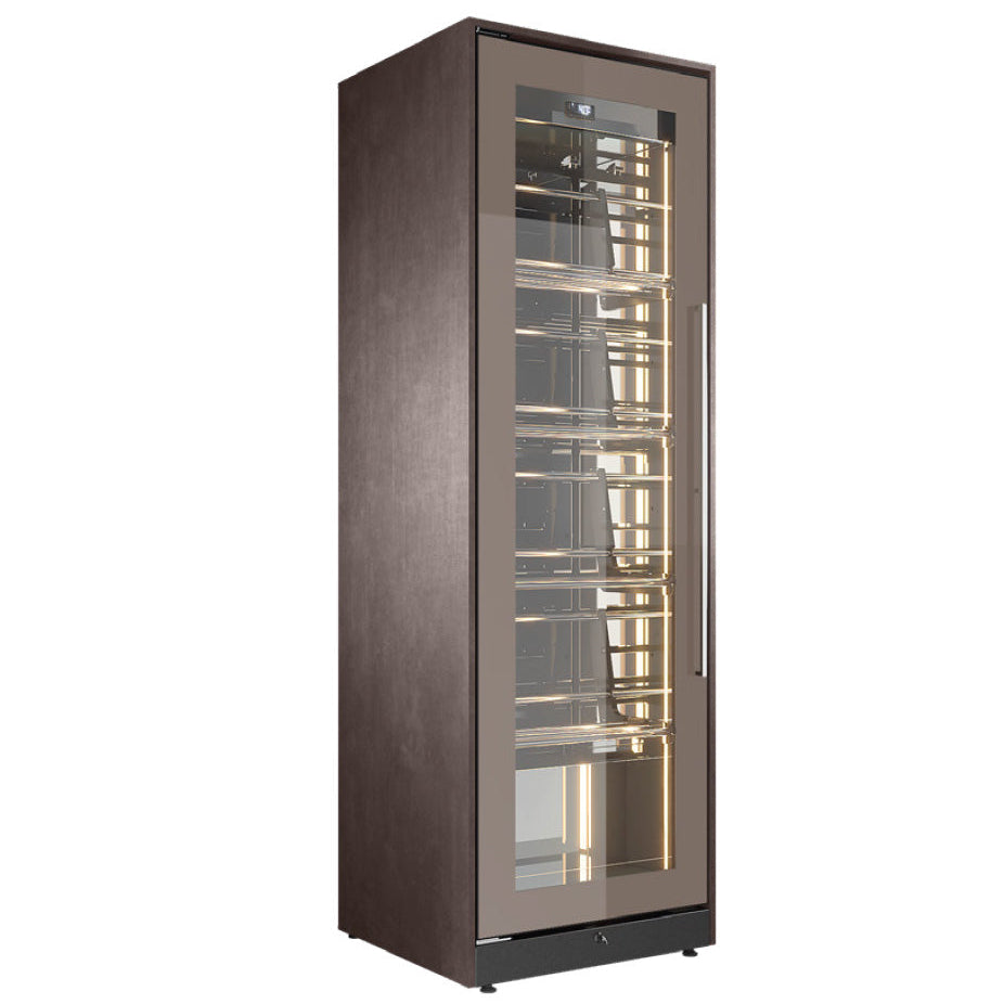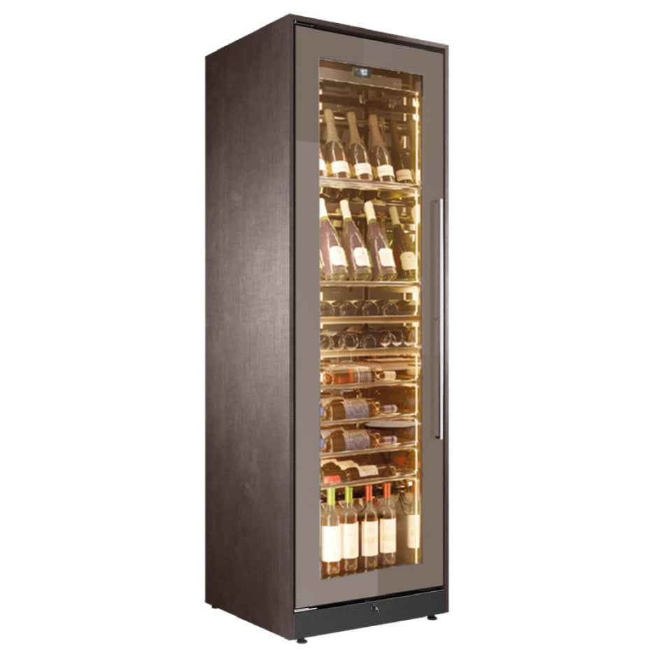 Die vertikal entlang des Korpus und des Stahlinnenraums eingesetzten LEDs (2700°K) erzeugen einen Tiefeneffekt und eine besondere Beleuchtung, die die Flaschen in den Vordergrund rückt.