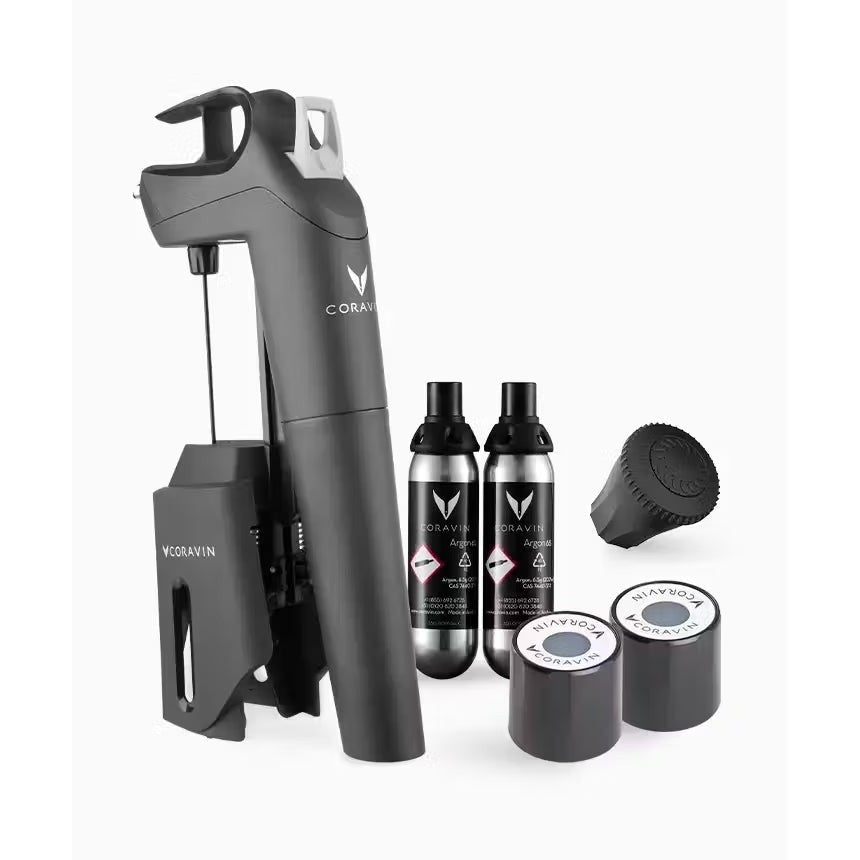Three+ in gray contains Timeless Three SL with one Coravin Pure™ Argon capsule, two packs of Coravin Pure™ Argon capsules, two Coravin screw caps and one Coravin Timeless aerator.
