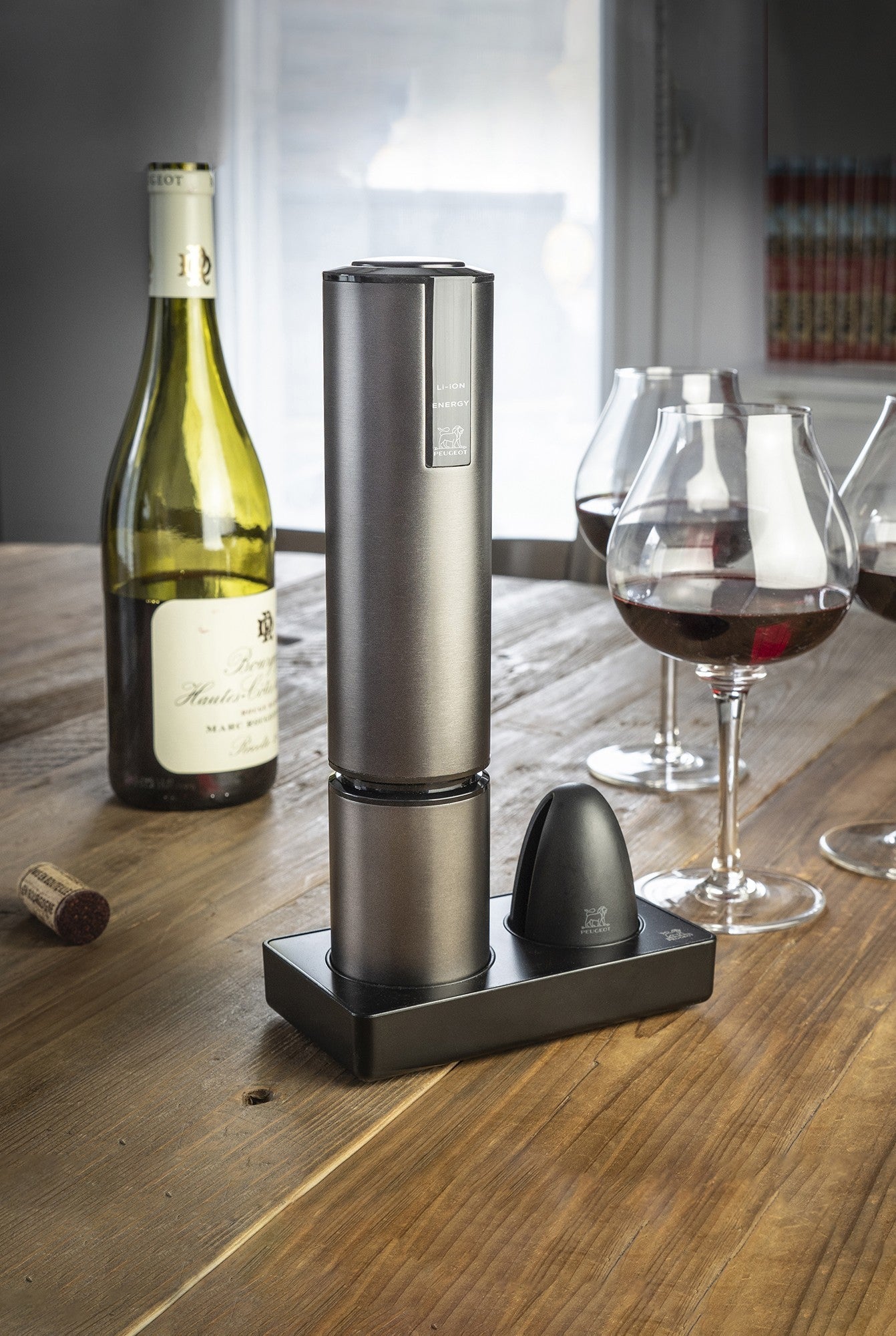 The Peugeot electric corkscrew and cutter set ensures effortless removal of wine bottle corks.