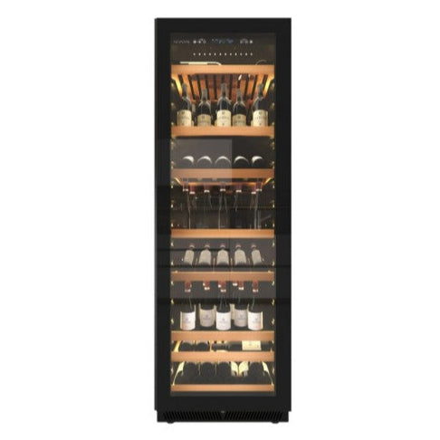 <p>Capacité : 150 bouteilles<br><img alt=""> Couleur : Noir<br> Température réglable : de 2° à 20°C<br> Porte entièrement en verre avec rainure latérale<br> Aménagement intérieur : 8 étagères coulissantes<br> Lumière LED à double émission tricolore<br> Contrôle tactile doux<br></p>