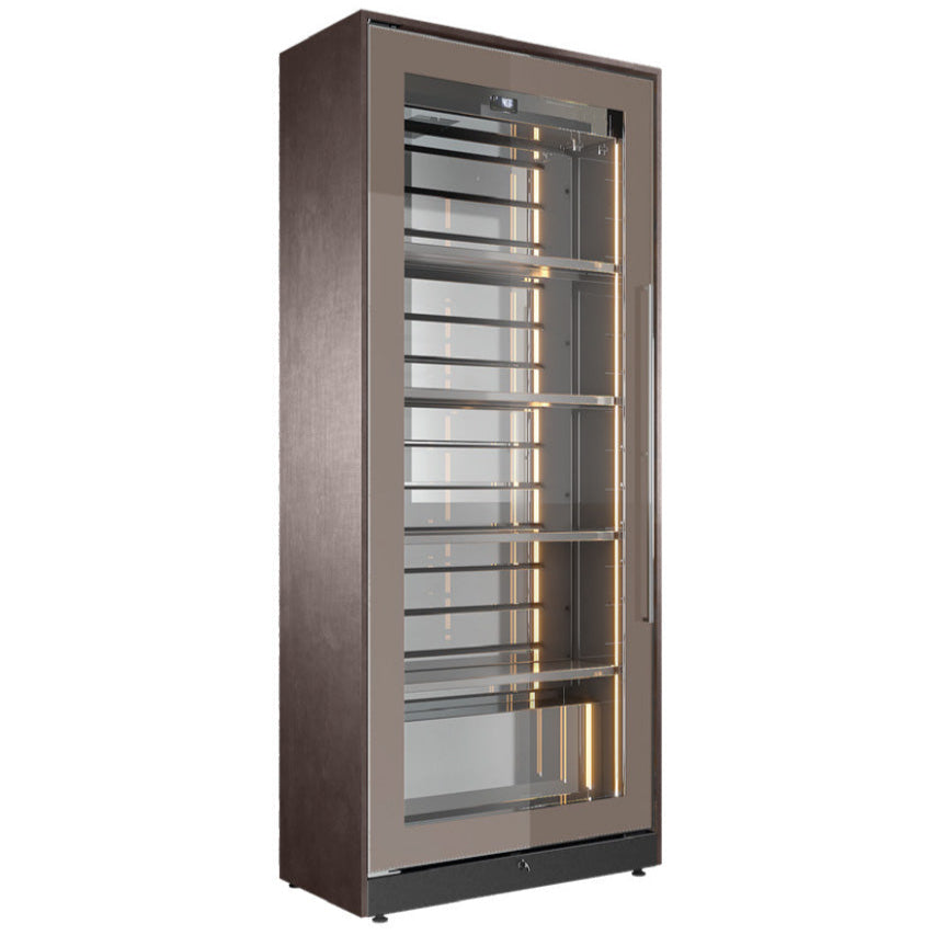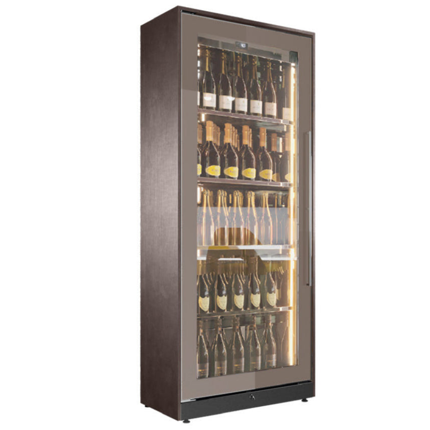 L'éclairage interne à LED sur les côtés latéraux et les intérieurs en acier créent un effet particulier de profondeur et des jeux de lumière suggestifs qui renforcent l'impact visuel des bouteilles, offrant un espace lumineux et accueillant.