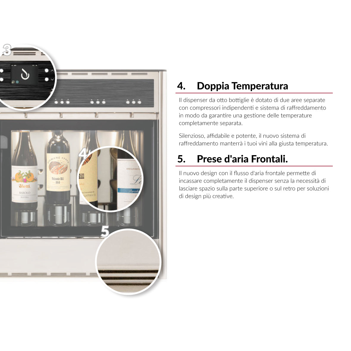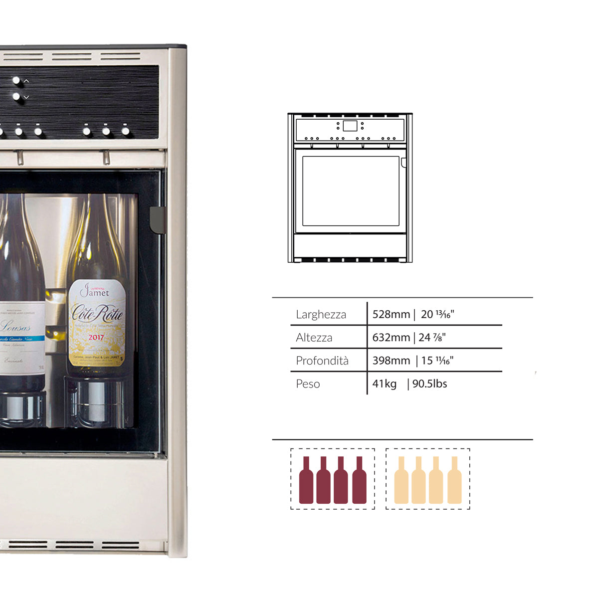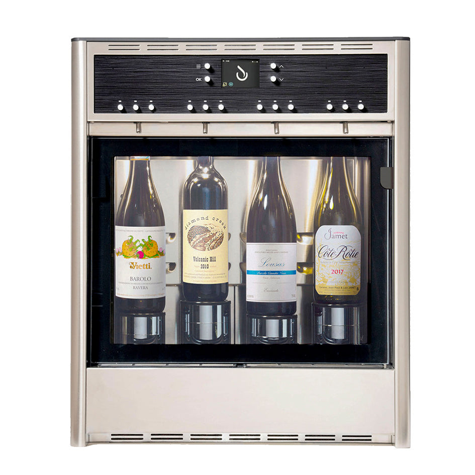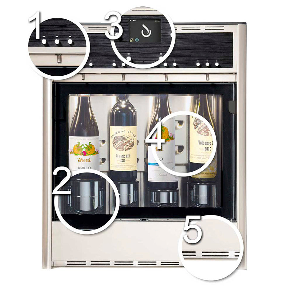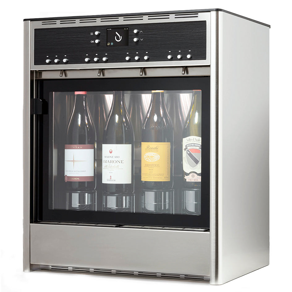 De wijnflessendispenser is ontworpen voor kleine commerciële bedrijven en proeverijen in de wijnkelder. Een elegante gekoelde vitrine die belangrijke technologische kwaliteiten combineert met design. Maximale stilte, grote efficiëntie en compacte afmetingen maken van deze dispenser een waardevolle bron om de kwaliteit van het product te waarborgen en verspilling te minimaliseren. Door inerte gassen zoals stikstof of argon in de fles te injecteren, wordt de lucht verdreven en wordt oxidatie van de wijn voorkomen.
