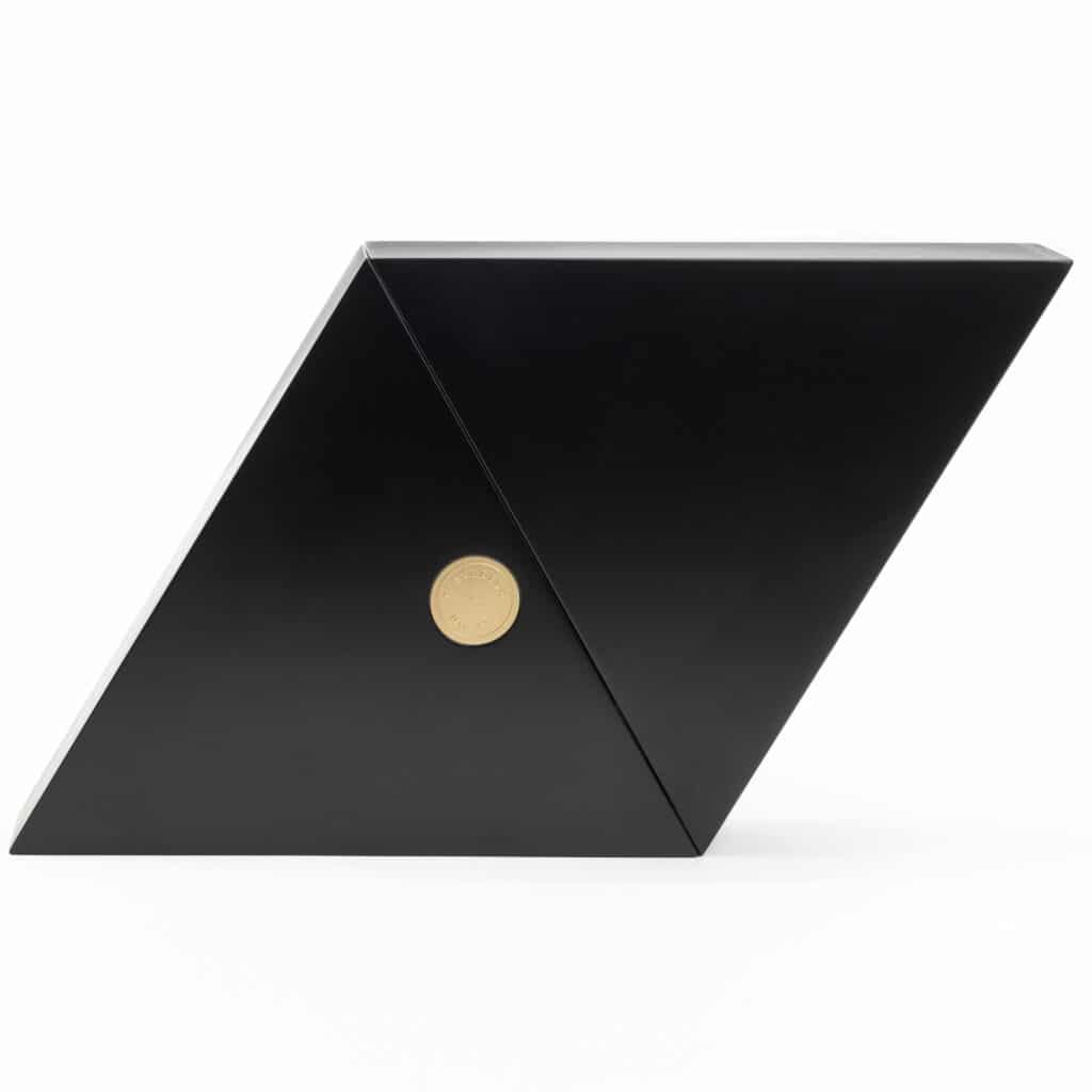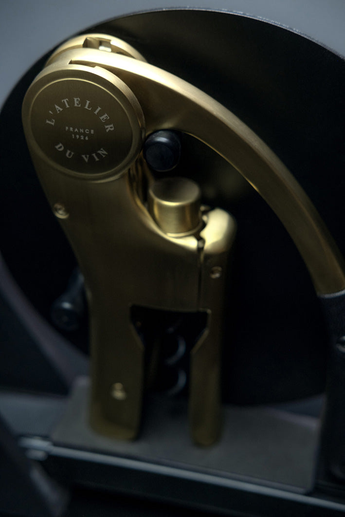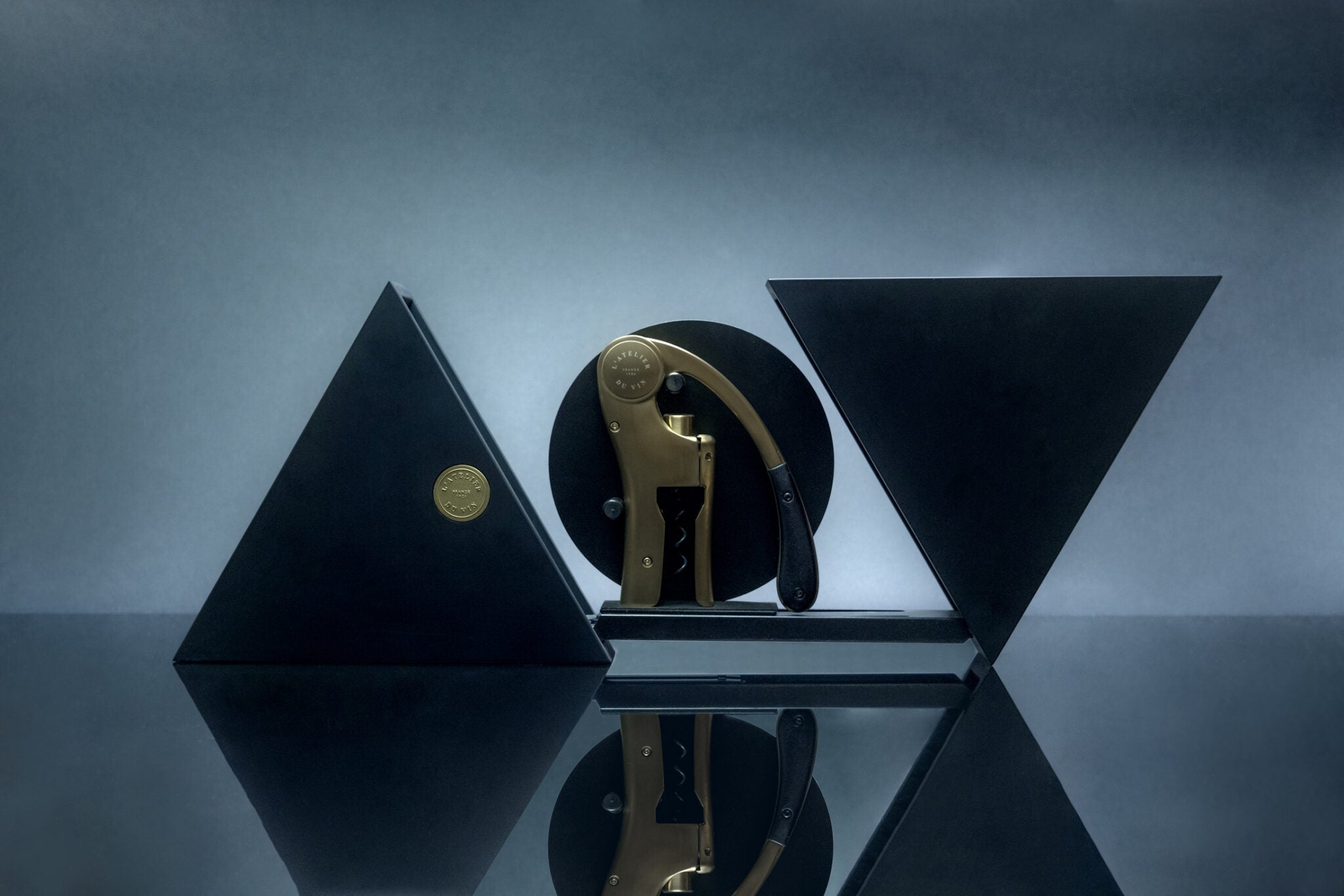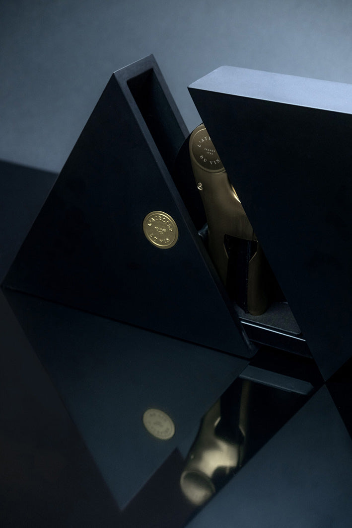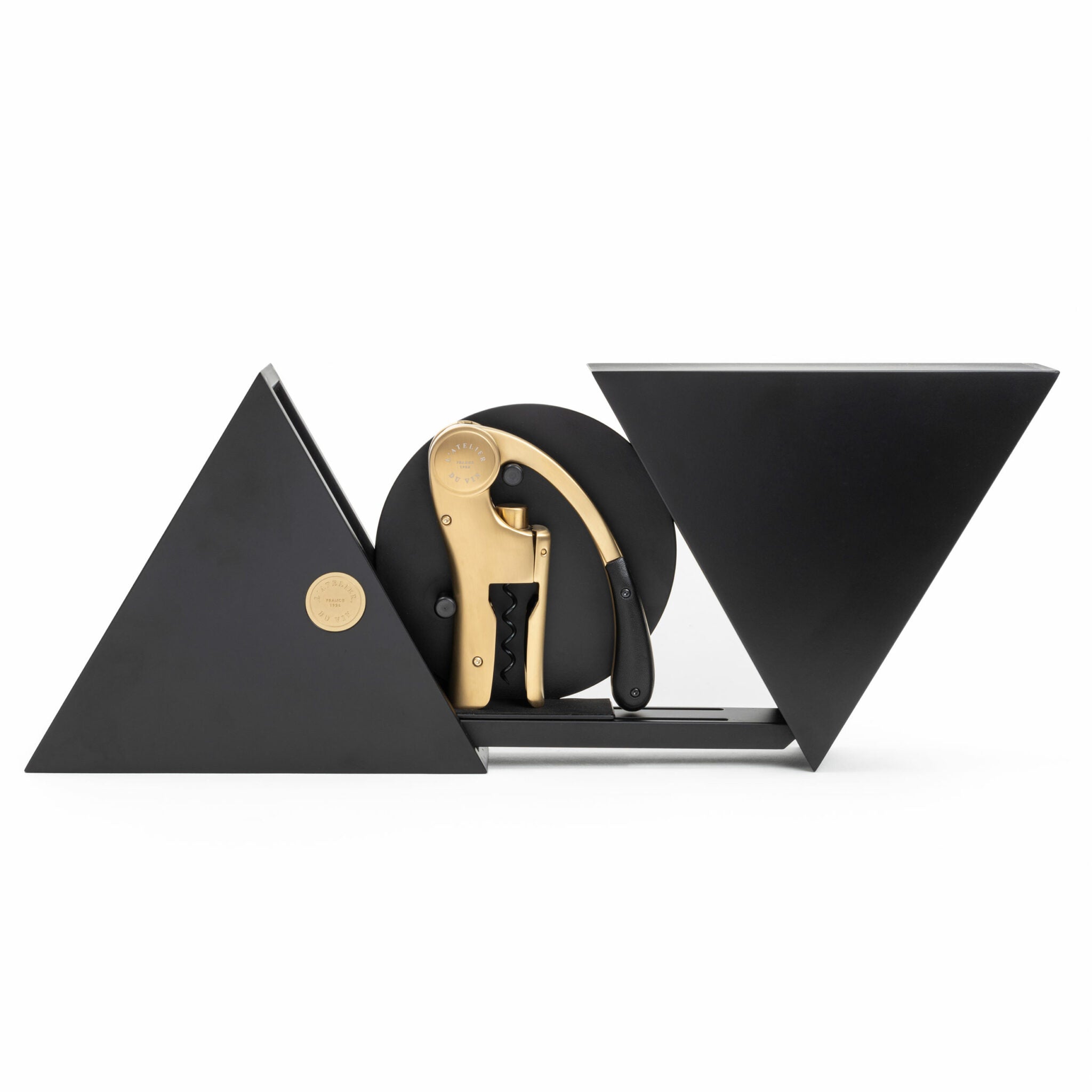 Net zoals wijn wordt bewaard in een fles, wordt deze roestvrijstalen flesopener bewaard in een elegante en tijdloze zwartgelakte houten sculptuur. Binnenin zijn minimalistische vorm schuilt een wijnschat van verfijnd vakmanschap: de Oeno Motion Gold-kurkentrekker, klaar om elke fles rode, witte of roséwijn met onberispelijke bewegingen te openen.