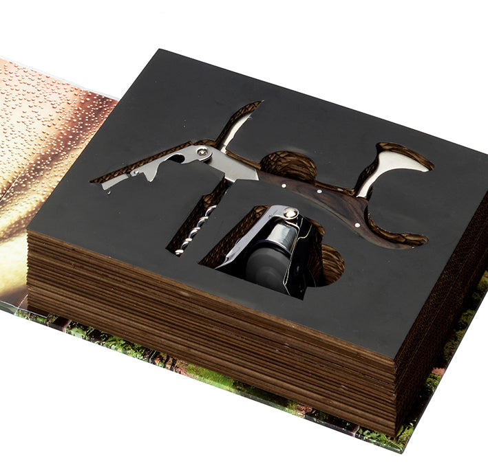 <p style="text-align:justify;">Set accessori per gli amanti del vino completo di cavatappi 4 in 1 e tappo Champagne<br>Vite professionale, pinze da champagne, coltello tagliacapsule, sollevatore di tappi<br>Tappo per champagne<br>Cavatappi in acciaio inossidabile con manico in legno Stamina e doppia leva<br>Confezione a scatola libro</p>