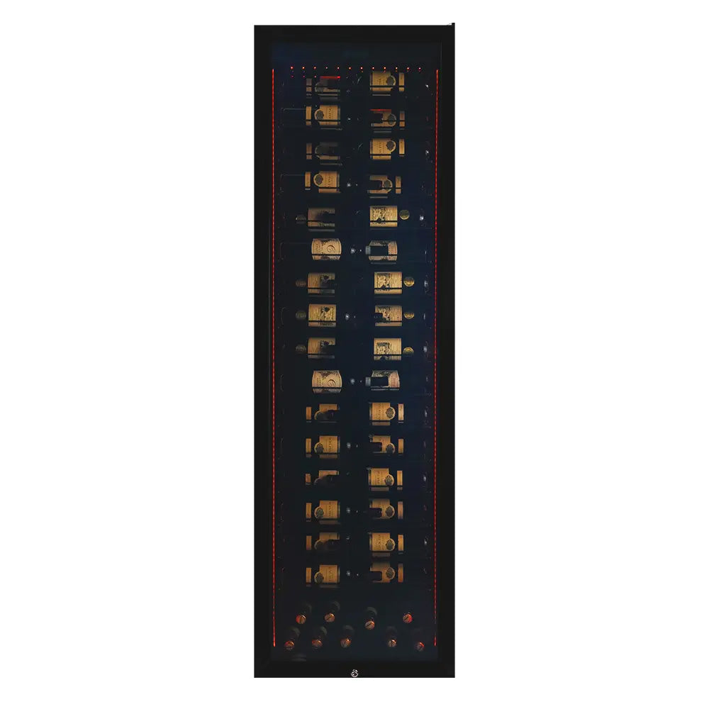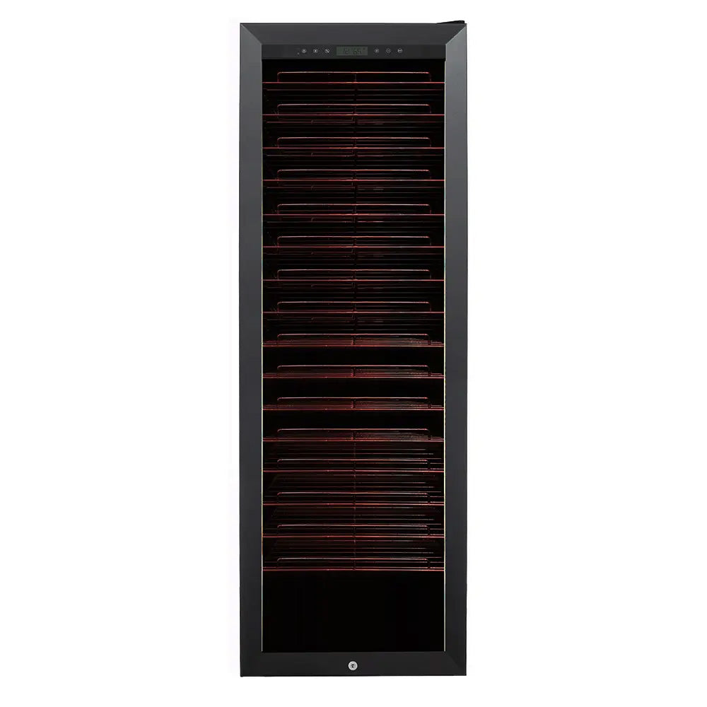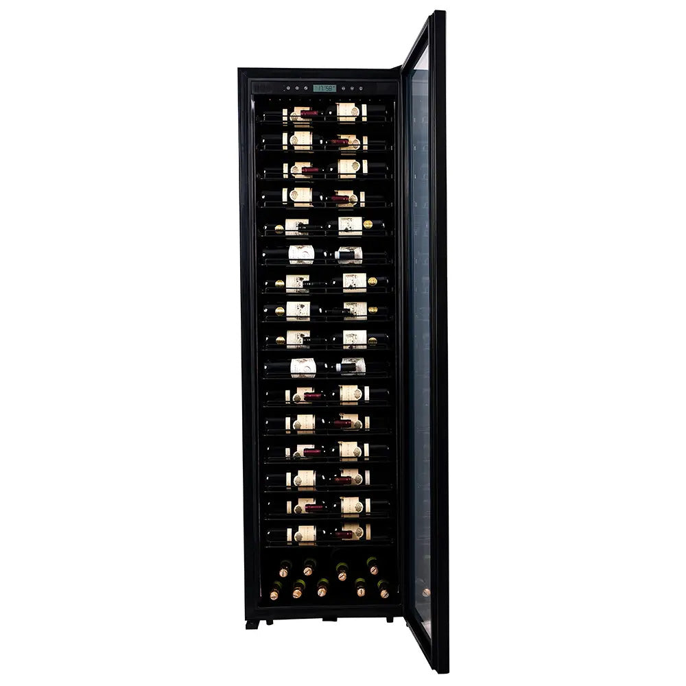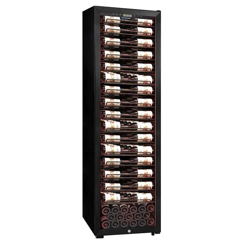 <p>Capacità: 161 Bottiglie*<br>Colore: Nero<br>Sistema di raffreddamento: Compressore<br>Refrigerazione: Ventilata<br>Temperatura Regolabile: da+5° a +20°C<br>Regolazione Elettronica<br>Termometro con display digitale<br>Illuminazione a LED arancioni dimmerabili<br>Anta in vetrocamera anti-UV</p>