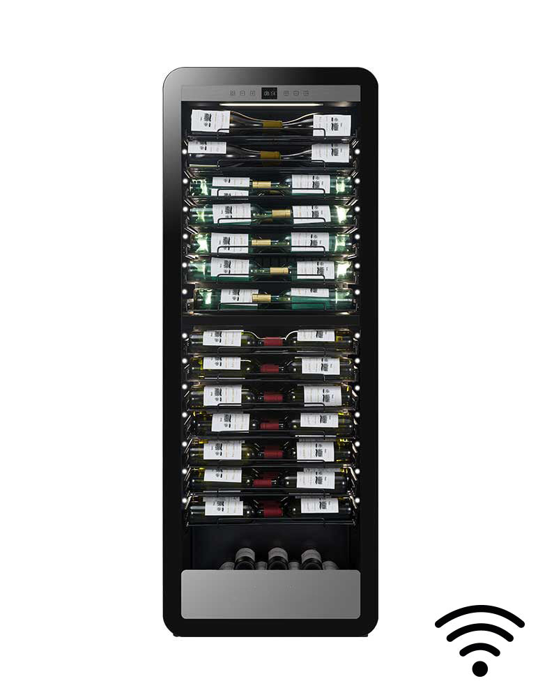 <p>Capcaità: 184 Bottiglie*<br>Libera Installazione<br>Colore Black<br>Sistema di raffreddamento: Compressore<br>Refrigerazione Ventilata<br>Temperatura regolabile:<br>- zona superiore da 5° a 12°C<br>- zona inferiore da 12° a 20°C<br>Regolazione elettrica<br>Termometro digitale con display bianco<br>Illuminazione LED bianca<br>Porta a vetro con serratura, triplo vetro grigio temperato con protezione anti UV<br>Dotata di collegamento Wifi<br>Compatibile con l'applicazione <a href="https://cdn.shopify.com/s/files/1/0561/8535/6486/files/VINOTAG.pdf?v=1663343823"><span style="color:rgb(150,0,0);"><strong>VINOTAG®,</strong></span></a><br><i>Consente l'organizzazione interna delle proprie bottiglie e la regolazione dei parametri di temperatura, illuminazione ed allarme; regolabili da remoto in qualsiasi momento dallo smartphone</i></p>