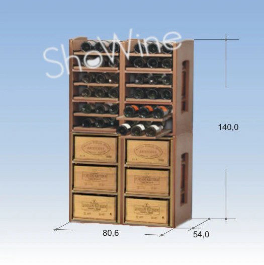 Questa soluzione, composta da due moduli base a pavimento con due moduli 6R sovrapposti, ha una capacità totale di 216 bottiglie (tipo bordolese da 0,75 lt.) e il tutto in pochissimo spazio: L cm 80,6 x A 140 x P 54