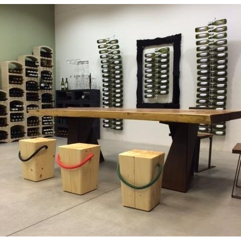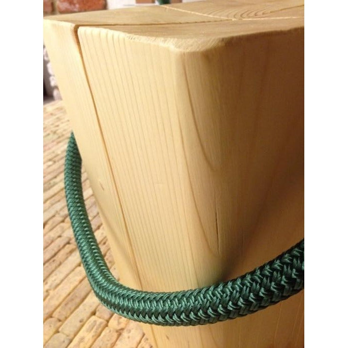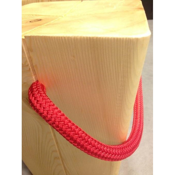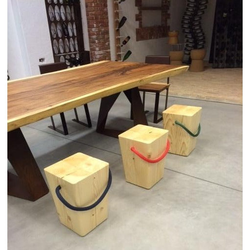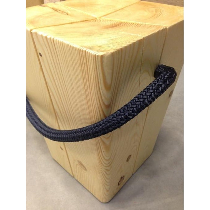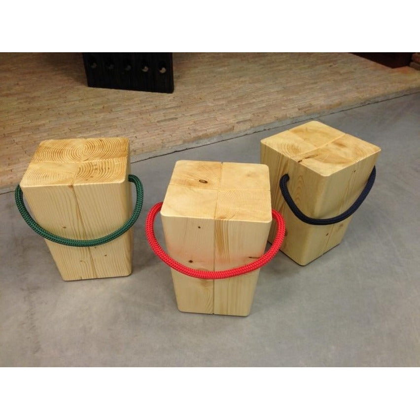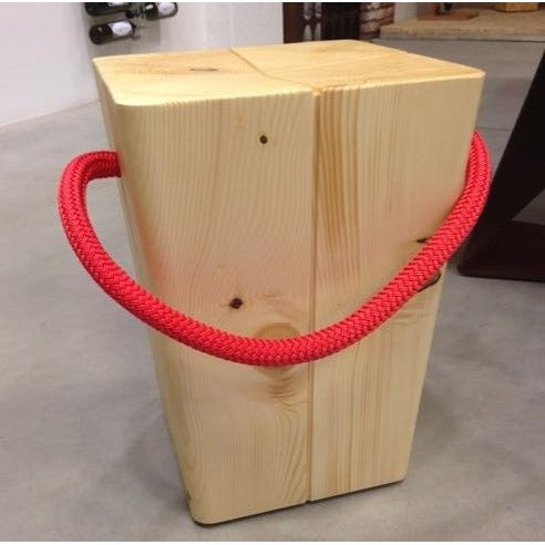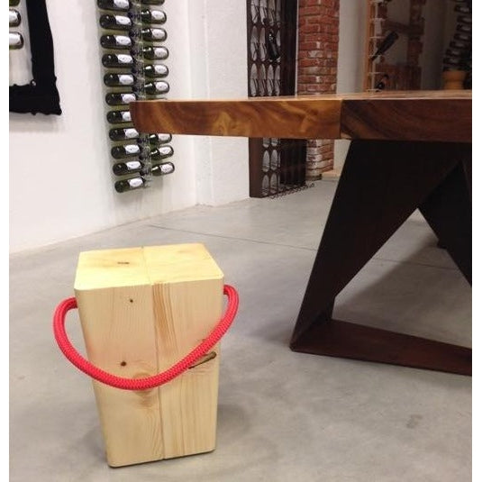 Sgabello in abete naturale o tinto con maniglia in corda colorata blu navy, verde inglese, rosso, canapa, bianco o nero.